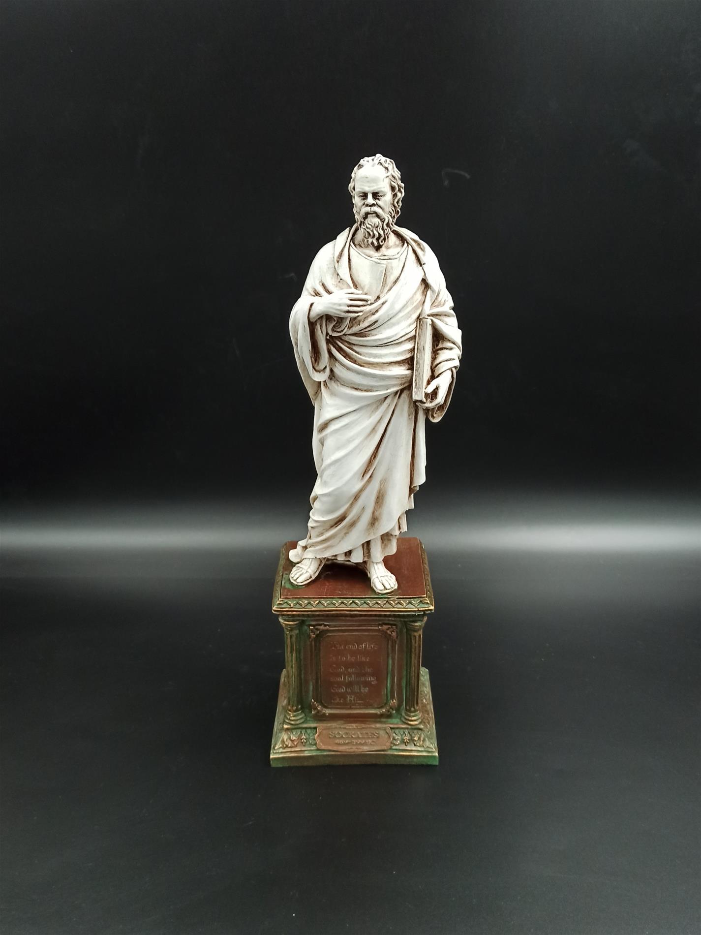 Sokrates’in bilgelik dolu duruşundan ilham alınarak özenle boyanmış dekoratif heykel.